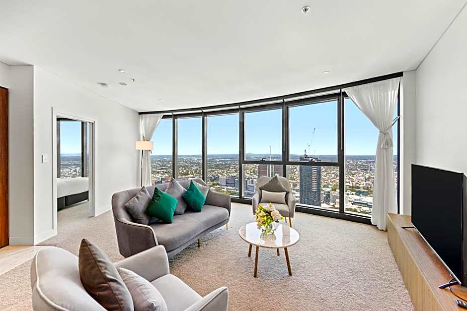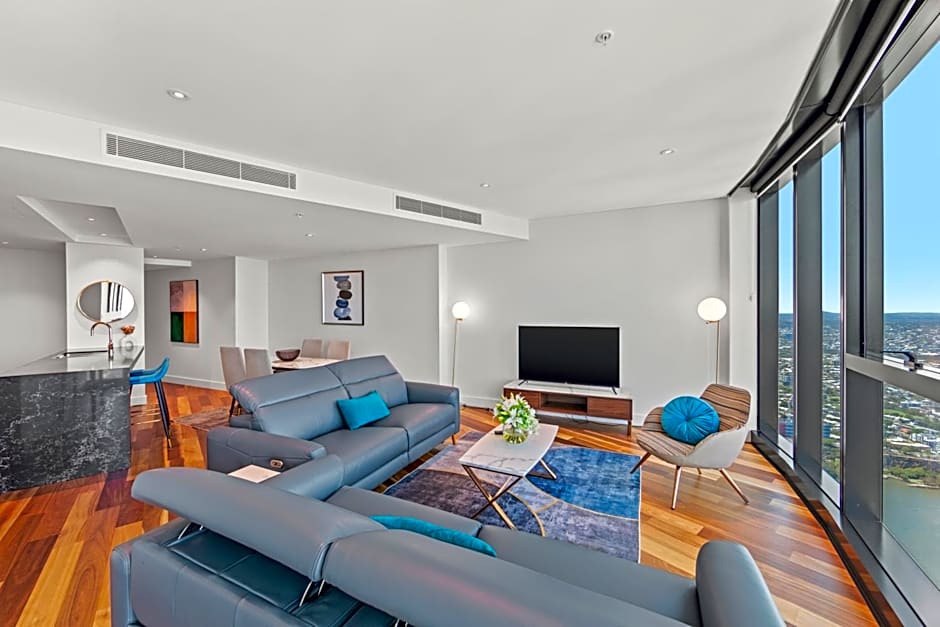 Located on levels 43 - 79 with views across Brisbane, this apartment has access to the recreational facilities on level 40 and 66. This modern, fully self-contained, 3-bedroom, 2-bathroom apartment has a well-appointed, fully equipped kitchen. There are a dining and living area, laundry facilities, and free unlimited WiFi.